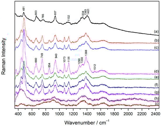 There are no studies specifically focused on the Raman spectrum of sugammadex; however, general characterization is necessary for further studies by the SERS technique. The Raman spectrum of SDX solution (5 × 10−2 M) was dominated by bands associated with vibrational modes of glucose: deformations of CH groups (1334 and 1383 cm−1), symmetrical stretching of C–O–C bonds (937 cm−1), in-plane deformation (765 cm−1), and out-of-plane deformation (481 cm−1) of the glucose ring (Figure 2a, Table 1) [24,25]. Bands at 1115 and 1132 cm−1 were assigned to the stretching vibrations of the C–C bond, while the intense band at 663 cm−1 was attributed to the stretching of the C–S bond [26].