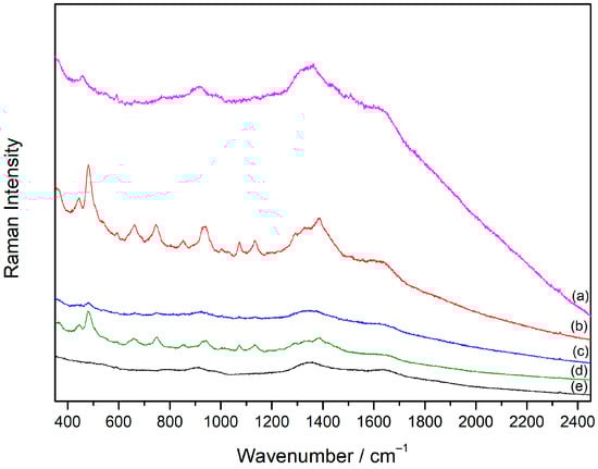 SERS spectra of SDX (1 × 10−5 M) in the silver colloid aggregated with inorganic salts: (a) KCl, (b) Ca(NO3)2, (c) CaCl2, (d) NaNO3, and (e) NaCl; c(salt) = 5 × 10−4 M. The spectra are displaced for visual clarity.