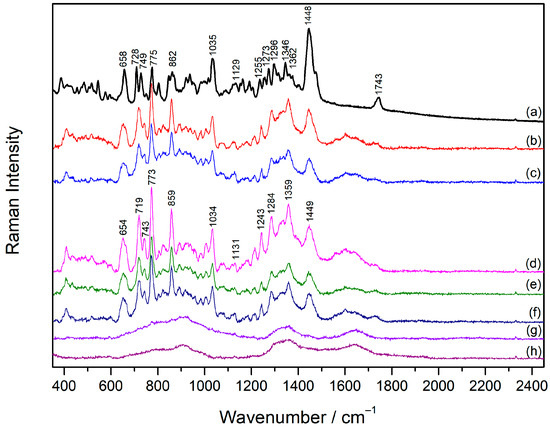 Similarly to Vec, the most intense band in the Raman spectrum of solid Roc, characteristic of steroids, was obtained at 1450 cm−1 (Figure 5a, Table 2). The bands in the spectral range between 1170 and 1380 cm−1 were attributed to CH2 deformation vibrations of androstane, pyrrole, and morpholine units in the molecular structure of the studied drug. The band typical for morpholine ring stretching was noted at 1040 cm−1 [36,37], while pyrrole and morpholine vibrations contributed to the band at 839 cm−1 [38,39]. Pyrrole CH deformations gave rise to the band at 1123 cm−1. The weak band at 1750 cm−1 originated from the C=O stretching vibration of the ester group, while the band at 1642 cm−1 was the result of the C=C stretching of the substituent on the pyrrole ring.