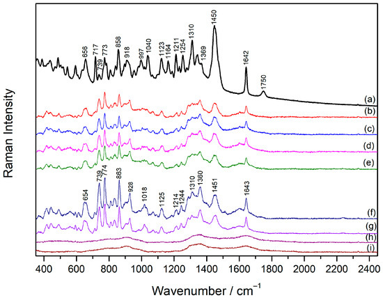 (a) The Raman spectrum of SDX solution (1 × 10−2 M) and the SERS spectra of SDX: (b) 1 × 10−4 M, (c) 5 × 10−5 M, (d) 1 × 10−5 M, (e) 5 × 10−6 M, (f) 1 × 10−6 M, (g) 5 × 10−7 M, (h) 1 × 10−7 M, and (i) the silver colloid. The spectra are displaced for visual clarity.