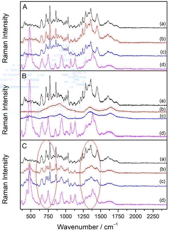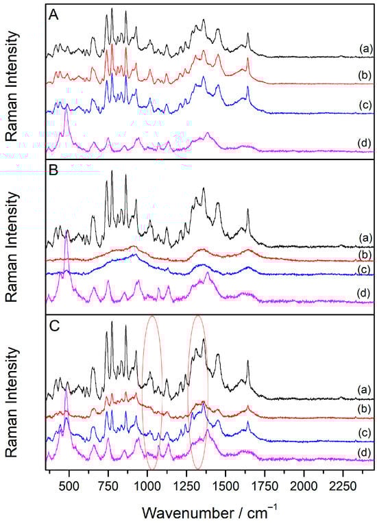 To assess whether the sequence of the component addition influenced Raman scattering enhancement, complexes were prepared using three different methods: (A) the drug was added to the silver colloid and incubated for 30 min before introducing SDX; (B) SDX was added to the silver colloid and incubated for 30 min before the drug was added; and (C) SDX and the drug were mixed and incubated for 30 min prior to adding the silver colloid. Spectra were recorded immediately after preparation and again following a 30 min incubation.