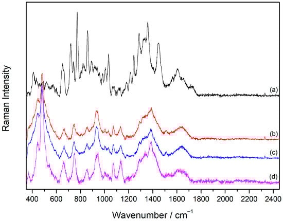 To enhance SDX adsorption onto silver nanoparticles, method B was modified by incubating SDX with the silver colloid in the presence of the aggregating salt Ca(NO3)2 (5 × 10−4 M) for 30 min before adding Vec (Figure 8). Interestingly, the resulting spectra showed bands corresponding to SDX but none for Vec. The addition of the inorganic salt caused silver nanoparticle aggregation, creating SERS-active sites and facilitating SDX adsorption onto the metal surface. However, there was no spectral evidence of interactions between the adsorbed SDX molecules and the subsequently added Vec, indicating that the cyclodextrin/drug complex did not form on the silver surface.