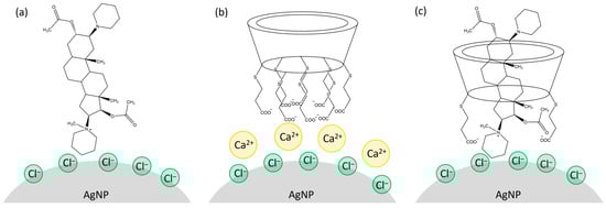 Scheme of adsorption of (a) Vec, (b) SDX, and (c) SDX/Vec complex onto the silver nanoparticle surface.
