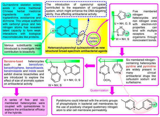 Design of heteroarylcyanovinyl quinazolones and quinazolone pyridiniums as potential antibacterial agents.