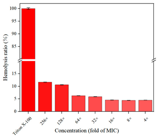 The hemolysis test is an indispensable evaluation criterion in drug research and clinical application. Healthy human red blood cells were treated by varying concentrations of compound 19a for 3 h, using saline and 1% Triton X-100 solution as negative and positive controls, respectively, and the percentage of red blood cell lysis was measured [35,36]. As depicted in Figure 2 and Figure S1, compound 19a exhibited a low hemolysis rate at a high concentration of 256 × MIC. At the concentration of 16-fold MIC, the hemolytic activity of quinazolone pyridinium 19a (4.57%) was below the highest international standard hemolytic rate of 5%, indicating the low toxicity of compound 19a to human blood cells.