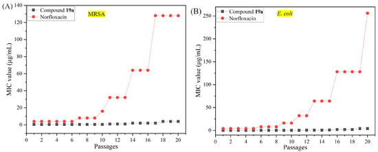 Resistance development of quinazolone pyridinium 19a and norfloxacin against MRSA (A) and E. coli (B).