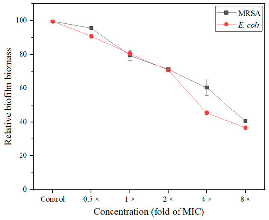 Bacterial biofilms composed of bacteria and their own extracellular polymers can protect bacteria from the killing of antibiotics and the impact of host immune response, increasing their resistance to antibiotics by 1000 times, resulting in wounds that are difficult to heal for a long time [44,45]. Therefore, the drug efficacy of antibacterial agents will be severely affected once biofilms are formed. Crystal violet staining assay was conducted to investigate the inhibitory effect of quinazolone pyridinium 19a on the formation of MRSA and E. coli biofilm [46,47]. As shown in Figure 5, compound 19a could inhibit biofilm formations of both bacteria in a concentration-dependent manner. The inhibitory rate of MRSA and E. coli biofilms exceeded 60% at the concentration of eightfold MIC. These results indicated the excellent anti-biofilm capability of quinazolone pyridinium 19a against MRSA and E. coli, potentially contributing to its low propensity for resistance development.