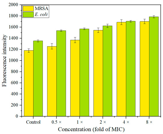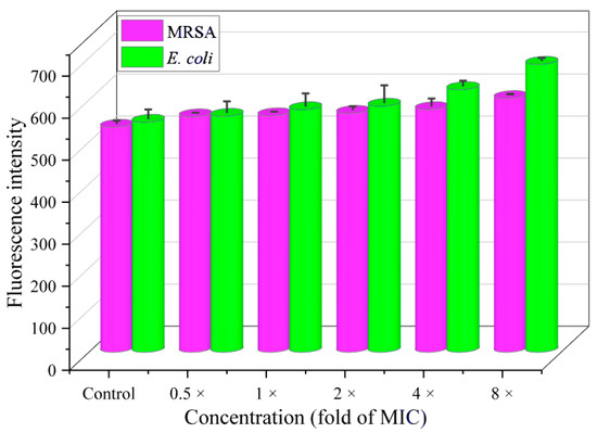 Inner membrane permeability was further investigated toward MRSA and E. coli to explore the membrane disruption of quinazolone pyridinium 19a using propidium iodide (PI), a living cell membrane impenetrable dye [59,60]. PI can only penetrate the cell membrane of dead bacteria to reach the nucleus, where it intercalates with the cell’s DNA to produce red fluorescence. The accumulation of red fluorescence within the cells of both MRSA and E. coli increased with the concentration of quinazolone pyridinium 19a, manifesting the increasing contents of the PI in bacterial cell and the gradual death of strains. Microscopy images of bacteria stained with PI (Figure 8B) also gave stronger red fluorescence after treatment, which underscored the enhanced permeability of the inner membranes of MRSA and E. coli induced by compound 19a.