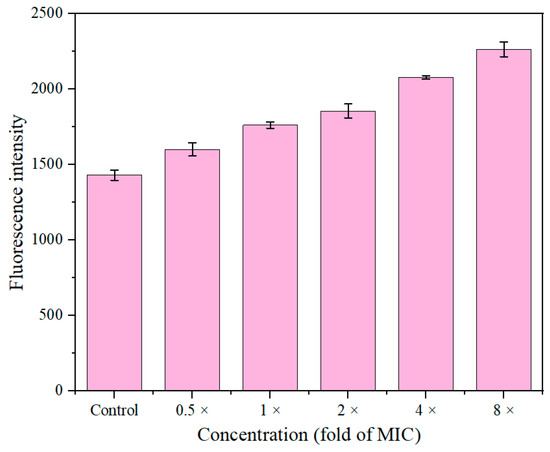 Gram-negative bacteria with a rigid protective outer shell are more difficult to inactivate than Gram-positive bacteria. The Gram-negative cell membranes composed of outer and inner membranes are conducive to prevent antibiotics and other antibacterial agents from entering and destroying the cells [55,56]. The permeabilizing effect of quinazolone pyridinium 19a on the outer membrane of E. coli was determined using hydrophobic 1-N-phenylnaphthylamine (NPN), a fluorescent indicator that emits fluorescence upon encountering membrane-internal hydrophobic substances [57,58]. As depicted in Figure 7, the fluorescence intensity positively correlated with the concentration of compound 19a, indicating that quinazolone pyridinium 19a could enhance the permeability of the E. coli outer membrane in a concentration-dependent manner, thereby compromising membrane integrity.