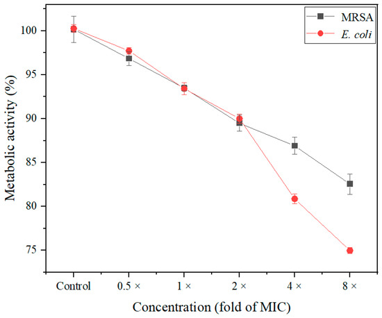 The change of metabolic activity in both bacteria types post-treatment with quinazolone pyridinium 19a was determined using the redox indicator Alamar Blue [66,67]. As depicted in Figure 11, the metabolic activity of MRSA and E. coli decreased to varying degrees after treatment with compound 19a, showing a negative correlation with the concentration of the compound. Notably, the metabolic activity of E. coli was more significantly affected than that of MRSA, which was consistent with the previous observations of inner membrane permeabilization. These results suggested that quinazolone pyridinium 19a would cause bacterial membrane damage and further lead to metabolic inactivation.
