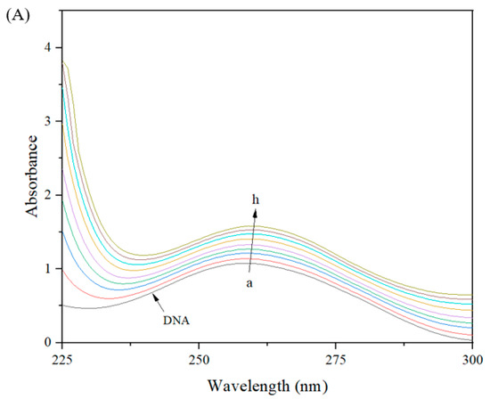 DNA as an essential biomacromolecule for bacterial development and normal metabolism has become a significant therapeutic target in multitudinous bacterial infections [68]. The damage to bacterial cell membranes facilitates the entry of quinazolone pyridinium 19a into the cells to bind with biological targets such as DNA, exerting its bioactivity. Therefore, the interaction between compound 19a and calf thymus DNA was explored using UV-visible and fluorescence spectroscopy.