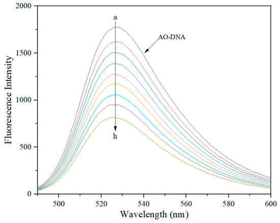 To identify the mode of interaction between DNA and compound 19a, competitive studies were conducted using the classical DNA intercalator acridine orange (AO) [71,72]. With increasing concentrations of compound 19a, a gradual decrease in the fluorescence intensity of the AO-DNA complex was observed in Figure 13, suggesting that compound 19a can replace the DNA intercalator AO and embed into calf thymus DNA.