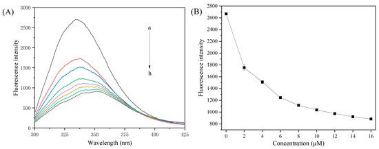 Binding of quinazolone pyridinium 19a to the PBP2a allosteric site (λex = 280 nm). (A) Emission spectra of acylated PBP2a intrinsic fluorescence with 19a at different concentrations. c(compound 19a) = 0−16 μM for curves a–h respectively at increment 2 μM. (B) The change in the maximum fluorescence intensity.