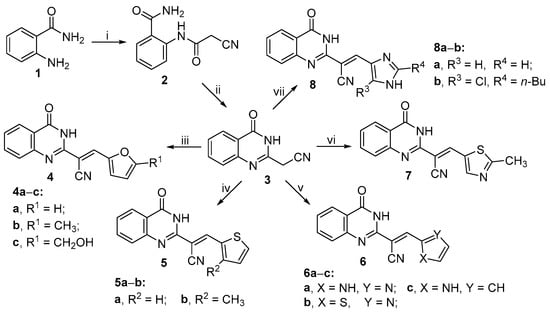 The desired heteroarylcyanovinyl quinazolones and quinazolone pyridiniums were synthesized according to Scheme 1, Scheme 2, Scheme 3 and Scheme 4. The amide intermediate 2 was prepared in 50.3% yield by the reaction of commercially purchased o-aminobenzamide with cyanoacetic acid in the presence of condensing agents 1-(3-dimethylaminopropyl)-3-ethylcarbodiimide hydrochloride and 1-hydroxybenzotriazole hydrate at room temperature, and further cyclization in a 10% sodium hydroxide aqueous solution produced the important precursor 3 with a high yield of 88.2%. Cyanomethylquinazolone 3 was condensed with different five-membered heteroaromatic aldehydes in the presence of piperidine as a catalyst and ethanol as a solvent to afford the target products 4–8 with yields ranging from 49.2–93.2% (Scheme 1). To explore the effect of the larger conjugated system on antibacterial activity, six-membered pyridine and pyrimidine aldehydes and some benzene-fused heterocyclic aldehydes were employed to prepare the target products 9–12 with yields ranging from 32.4–94.7% under the same reaction conditions (Scheme 2).