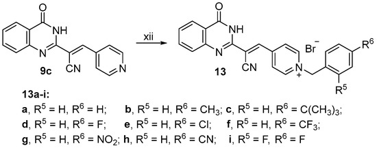 Preparation of quinazolone pyridiniums 13a–i. Reagents and conditions: (xii) benzyl bromides, potassium carbonate, acetonitrile, 80 °C.