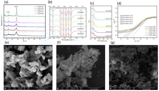 (a) XRD patterns, (b) FTIR spectra and (c) UV-Vis DRS spectra of as-prepared UCN-T. (d) The plots of (ahν)1/2 vs. hν. (e) SEM images of UCN-550. (f) SEM images of UCN-570. (g) SEM images of UCN-600. Characteristic peaks are designated using dashed lines.