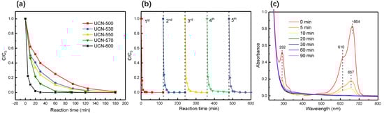 Furthermore, in order to gain insight into the MB degradation, the UV-Vis spectra of MB solution were recorded at different reaction times (Figure 2c). A main band with maximum absorption at 664 nm and a small shoulder at 610 nm was located in the visible region, and a band at 292 nm was found in the ultraviolet region. The absorbance at 664 nm can be assigned to the conjugation effect of two dimethylamine-substituted aromatic rings through sulfur and nitrogen, while the shoulder at 610 nm can be attributed to the dye dimmer; the absorption bands in the ultraviolet region are caused by the substituted benzenes rings. It was clearly observed that the intensity of the peaks decreased rapidly, and the peaks at 664 nm slightly shifted to 657 nm during the reaction, indicating the formation of the demethylated dyes [].