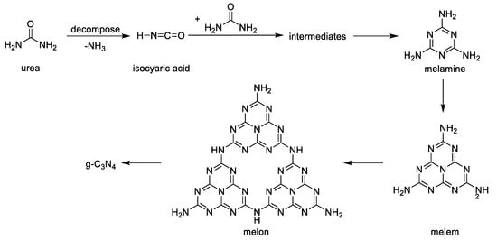 Generally, the crystal structures of g-C3N4 can be tuned by using different condensation temperatures. Xu et al. explained two different structures of g-C3N4 through thermal condensation of urea. During the heating process, the transformation of urea could be summarized as follows: urea → ammonia and isocyanic acid → cyanuric acid and other intermediates → melamine → melem and melon (Scheme 1). It was observed that the g-C3N4 with a planar structure (Figure S2a) could be formed when melem was fully condensed, while the g-C3N4 with a linear structure (Figure S2b) could be formed when melem was partially condensed to form NH bridges [].