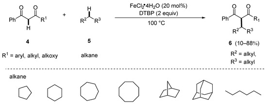 - Zhang, Y.; Li, C.-J. Highly Efficient Direct Alkylation of Activated Methylene by Cycloalkanes. Eur. J. Org. Chem. 2007, 2007, 4654–4657. [Google Scholar] [CrossRef]