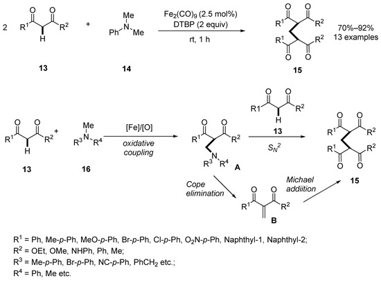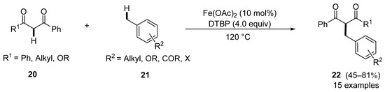 - Yang, K.; Song, Q. Fe-Catalyzed Double Cross-Dehydrogenative Coupling of 1,3-Dicarbonyl Compounds and Arylmethanes. Org. Lett. 2015, 17, 548–551. [Google Scholar] [CrossRef] [PubMed]