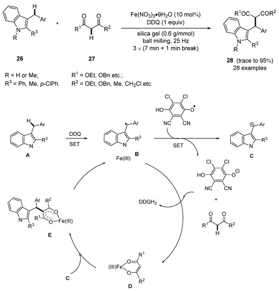 - Yu, J.-B.; Zhang, Y.; Jiang, Z.-J.; Su, W.-K. Mechanically Induced Fe(III) Catalysis at Room Temperature: Solvent-Free Cross-Dehydrogenative Coupling of 3-Benzylic Indoles with Methylenes/Indoles. J. Org. Chem. 2016, 81, 11514–11520. [Google Scholar] [CrossRef]
