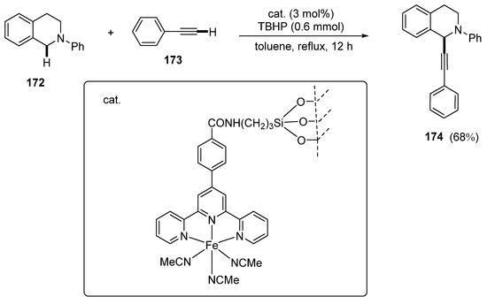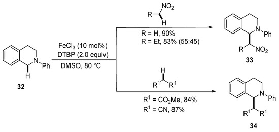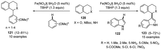 - Ghobrial, M.; Harhammer, K.; Mihovilovic, M.D.; Schnürch, M. Facile, solvent and ligand free iron catalyzed direct functionalization of N-protected tetrahydroisoquinolines and isochroman. Chem. Commun. 2010, 46, 8836–8838. [Google Scholar] [CrossRef]