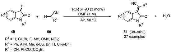 - Tan, Z.-Y.; Wu, K.-X.; Huang, L.-S.; Wu, R.-S.; Du, Z.-Y.; Xu, D.-Z. Iron-catalyzed cross-dehydrogenative coupling of indolin-2-ones with active methylenes for direct carbon–carbon double bond formation. Green Chem. 2020, 22, 332–335. [Google Scholar] [CrossRef]