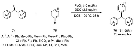 - Li, Z.; Cao, L.; Li, C.-J. FeCl2-Catalyzed Selective C-C Bond Formation by Oxidative Activation of a Benzylic C-H Bond. Angew. Chem. Int. Ed. 2007, 46, 6505–6507. [Google Scholar] [CrossRef]