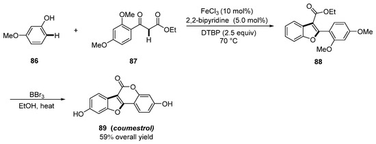 - Kshirsagar, U.A.; Parnes, R.; Goldshtein, H.; Ofir, R.; Zarivach, R.; Pappo, D. Aerobic Iron-Based Cross-Dehydrogenative Coupling Enables Efficient Diversity-Oriented Synthesis of Coumestrol-Based Selective Estrogen Receptor Modulators. Chem.-Eur. J. 2013, 19, 13575–13583. [Google Scholar] [CrossRef]