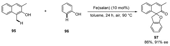 - Oguma, T.; Katsuki, T. Iron-catalysed asymmetric tandem spiro-cyclization using dioxygen in air as the hydrogen acceptor. Chem. Commun. 2014, 50, 5053–5056. [Google Scholar] [CrossRef]
