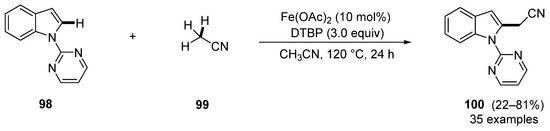 - Qiao, K.; Zhang, D.; Zhang, K.; Yuan, X.; Zheng, M.-W.; Guo, T.-F.; Fang, Z.; Wan, L.; Guo, K. Iron(ii)-catalyzed C-2cyanomethylation of indoles and pyrroles via direct oxidative cross-dehydrogenative coupling with acetonitrile derivatives. Org. Chem. Front. 2018, 5, 1129–1134. [Google Scholar] [CrossRef]