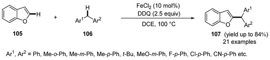 - Zhou, J.; Li, T.; Li, M.; Li, C.; Hu, X.; Jin, L.; Sun, N.; Hu, B.; Shen, Z. FeCl2-Catalyzed Direct C2-Benzylation of Benzofurans with Diarylmethanes via Cross Dehydrogenative Coupling. Asian J. Org. Chem. 2021, 10, 549–553. [Google Scholar] [CrossRef]
