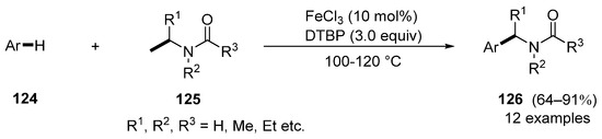- Shirakawa, E.; Uchiyama, N.; Hayashi, T. Iron-Catalyzed Oxidative Coupling of Alkylamides with Arenes through Oxidation of Alkylamides Followed by Friedel−Crafts Alkylation. J. Org. Chem. 2011, 76, 25–34. [Google Scholar] [CrossRef]