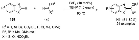 - Hu, R.-M.; Lai, Y.-H.; Xu, D.-Z. Iron-Catalyzed Aerobic Oxidative Cross-Dehydrogenative C(sp3)–H/X–H (X = C, N, S) Coupling Reactions. Synlett 2020, 31, 1753–1759. [Google Scholar]
