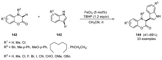 - Huo, C.; Dong, J.; Su, Y.; Tang, J.; Chen, F. Iron-catalyzed oxidative sp3 carbon–hydrogen bond functionalization of 3,4-dihydro-1,4-benzoxazin-2-ones. Chem. Commun. 2016, 52, 13341–13344. [Google Scholar] [CrossRef]