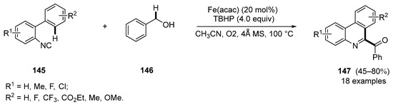 - Nie, Z.; Ding, Q.; Peng, Y. Synthesis of 6-aroyl phenanthridines by Fe-catalyzed oxidative radical cyclization of 2-isocyanobiphenyls with benzylic alcohols. Tetrahedron 2016, 72, 8350–8357. [Google Scholar] [CrossRef]