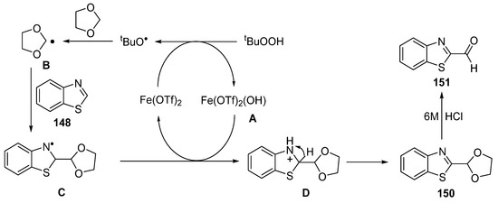 - Wu, Y.; Guo, P.; Chen, L.; Duan, W.; Yang, Z.; Wang, T.; Chen, T.; Xiong, F. Iron-catalyzed tandem oxidative coupling and acetal hydrolysis reaction to prepare formylated benzothiazoles and isoquinolines. Chem. Commun. 2021, 57, 3271–3274. [Google Scholar] [CrossRef] [PubMed]