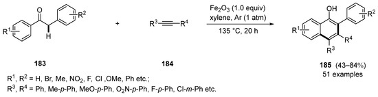 - Zhu, X.-Q.; Guo, R.-L.; Zhang, X.-L.; Gao, Y.-R.; Jia, Q.; Wang, Y.-Q. Iron-Promoted Domino Dehydrogenative Annulation of Deoxybenzoins and Alkynes Leading to β-Aryl-α-Naphthols. Adv. Synth. Catal. 2020, 362, 3190–3201. [Google Scholar] [CrossRef]