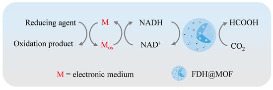 MV2+ can also be used as an electron acceptor and transfer catalyst in the electrocatalytic redox reaction [109]. Liu’s team developed an nFDH@ZIF-90@CA double-enzyme microreactor, where FDH was first encapsulated in polyacrylamide microcapsules and then covalently bonded to ZIF-90. This dual protection strategy considerably enhanced the chemical, thermal, and storage stability of the immobilized enzyme. In the enzyme electrocatalytic system using MV2+ as the electron mediator, the CO2 reduction capacity was markedly improved, with the rate of NADH regeneration increased. After 3 h of reaction, the formic acid yield reached 2.917 mM, which was 8.9 times greater than that of the free enzyme system. This offered an efficient and sustainable solution for converting CO2 into formic acid [82]. Because of its unique chemical structure and properties, MV2+ is widely used as an electron mediator in electrocatalysis. However, due to the biological toxicity of MV2+, it is necessary to pay great attention to safety and stability factors during its use.