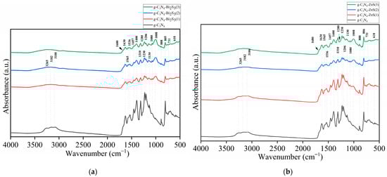 FTIR spectra of (a) g-C3N4 and g-C3N4-ZnS; (b) g-C3N4, and g-C3N4-Bi2S3.
