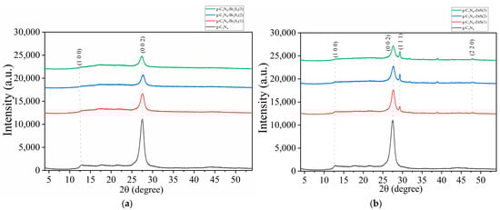 The X-ray diffraction (XRD) pattern of g-C3N4, g-C3N4-Bi2S3, and g-C3N4-ZnS composites (Figure 2a,b) elucidates the structural characteristics of graphitic carbon nitride (g-C3N4), bismuth sulfide (Bi2S3), and zinc sulfide (ZnS) phases. Pure g-C3N4 (black curve) has a significant peak at around 27.4°, corresponding to the (002) plane, indicating the layered stacking architecture of the g-C3N4 sheets. This peak is indicative of g-C3N4 and signifies its layered structure, similar to that of graphite. A supplementary, diminished peak often appears at 13.1°, correlating with the (100) plane and signifying the in-plane structural arrangement of the heptazine units constituting g-C3N4. Collectively [27], these peaks confirm the layered and crystalline structure of g-C3N4.