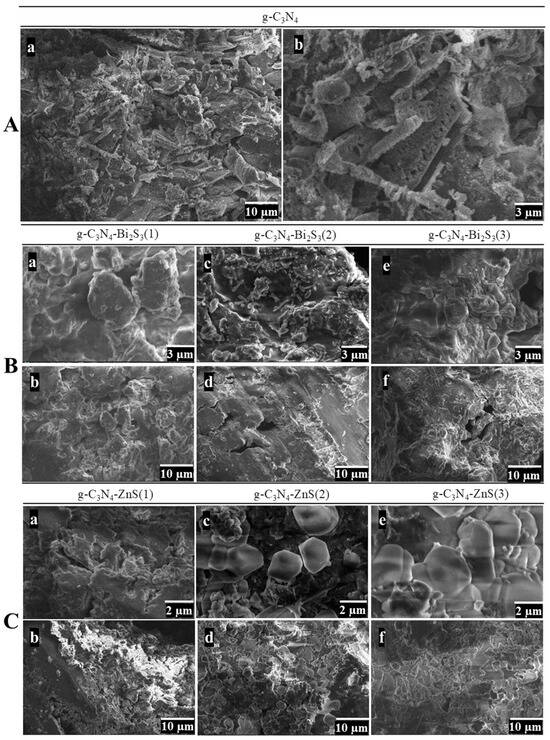 SEM images of (A) g-C3N4 at low (5000×) (a) and high (15,000×) (b) magnification. (B) g-C3N4-Bi2S3 at high (15,000×) (a,c,e) and low (5000×) (b,d,f) magnification. (C) g-C3N4-ZnS at high (20,000×) (a,c,e) and low (5000×) (b,d,f) magnification.