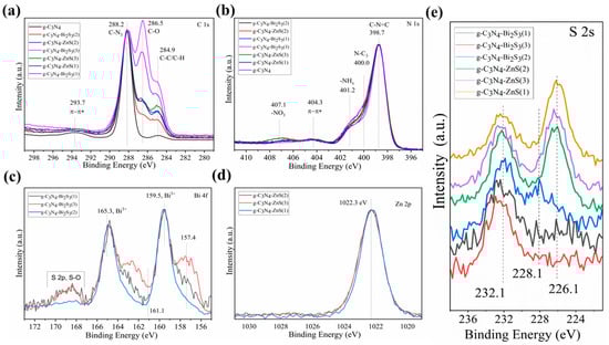 The results of an XPS investigation of the valence state and chemical environment of the component elements in the g-C3N4, g-C3N4-Bi2S3, and g-C3N4-ZnS nanocomposites are shown in Figure 5. The distinctive review spectrum (Figure 5a–e) indicates the presence of C 1s, N 1s, O 1s, Bi 4f, Zn 2p, and S 2s elements. The lack of other peaks indicates that the nanocomposite g-C3N4-Bi2S3 and g-C3N4-ZnS primarily include the elements C, N, O, S, Bi, and Zn.