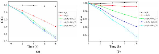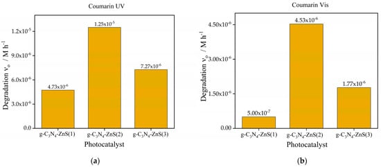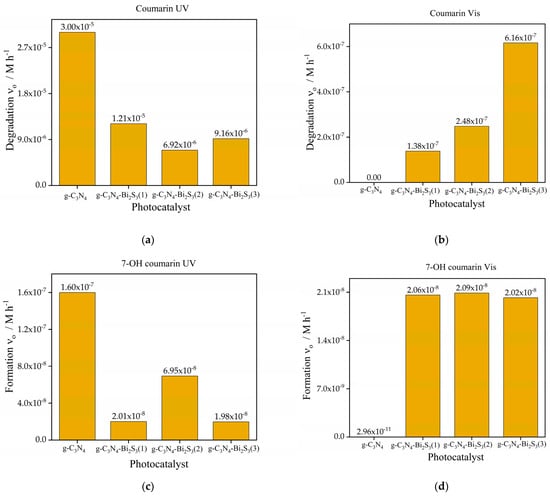 The initial rate of coumarin degradation under UV light is higher for pure g-C3N4, as seen in Figure 6a, demonstrating its high efficiency in photocatalytic UV exposure. Nonetheless, when the concentration of Bi2S3 increases in the modification of g-C3N4, the degradation rate progressively diminishes. An example is g-C3N4-Bi2S3(1), which has a reduced degradation rate relative to pure g-C3N4 (1.21 × 10−5 M h−1), with additional reductions seen in g-C3N4-Bi2S3(2) and g-C3N4-Bi2S3(3). This indicates that increased Bi2S3 concentrations inhibit the catalytic efficacy of g-C3N4 for coumarin under UV illumination, perhaps because Bi2S3 is less efficient at absorbing and utilizing UV photons than g-C3N4.
