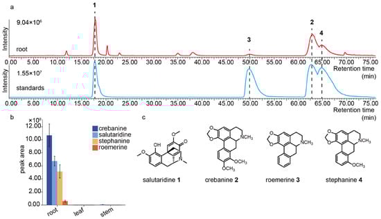 (a) Determination of BIAs in S. yunnanensis. LC-MS chromatogram of S. yunnanensis roots, with peaks of four compounds labeled with corresponding numbers. Compounds 1, 2, 3, and 4 correspond to salutaridine, crebanine, roemerine, and stephanine. The concentration of all four chemical standards was 0.02 mM. (b) A bar chart of the relative content based on the average peak area, with four compounds represented by different colors. (c) The structures of the four main BIAs.