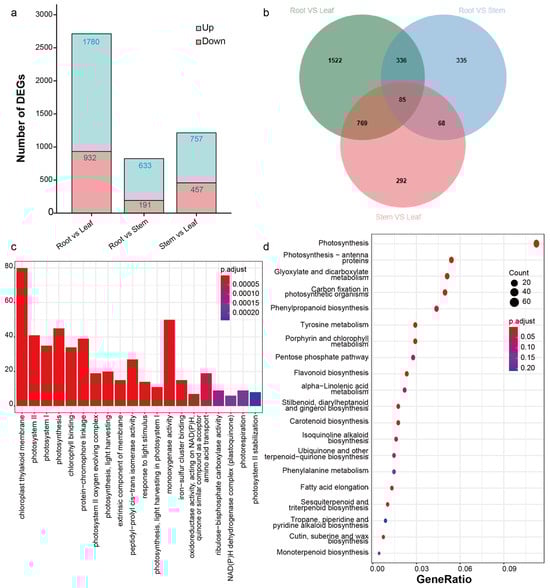 Functional annotation of DEGs. (a) DEGs of root vs. leaf, root vs. stem, and stem vs. leaf in S. yunnanensis and their Venn diagram (b), where circles in different colors represent the DEGs between different organ combinations. Green represents “root vs. leaf”, blue represents “root vs. stem”, and pink represents “stem vs. leaf”. The overlapping areas of two circles indicate DEGs common to two organ combinations, while the overlapping area of all three circles represents DEGs common to all three organ combinations. (c) GO enrichment analysis of DEGs in root vs. leaf. (d) Scatterplot of KEGG pathway enrichment of DEGs in root vs. leaf.