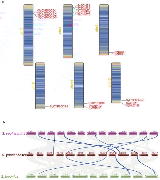 Chromosomal localization of S. yunnanensis gene and synteny analysis of the genomes of three Stephania species. (a) Chromosomal localization of candidate genes for BIA biosynthesis in S. yunnanensis. Pseudomolecules are represented as long bars, with colors indicating gene density: blue for low density and red for high density. (b) Synteny analysis of the genomes of three Stephania species, with the candidate genes in S. yunnanensis highlighted.