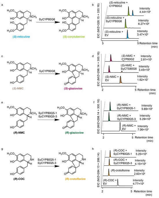 In vitro functional validation of the CYP80s from S. yunnanensis. SyCYP80G6 was responsible for catalyzing (S)-type substrates, and SyCYP80Q5 was responsible for catalyzing (R)-type substrates. The color of each product’s name corresponds to the colors of the chromatographic peaks. (a,b) SYCYP80G6 catalyzes the conversion of (S)-reticuline into (S)-corytuberine. (c,d) SyCYP80G6 catalyzes the conversion of (S)-NMC into (S)-glaziovine. (e,f) SyCYP80Q5-1 and SyCYP80Q5-3 catalyze the conversion of (R)-NMC into (R)-glaziovine. (g,h) SyCYP80Q5-1 and SyCYP80Q5-3 catalyze the conversion of (R)-COC into (R)-crotoflorine.