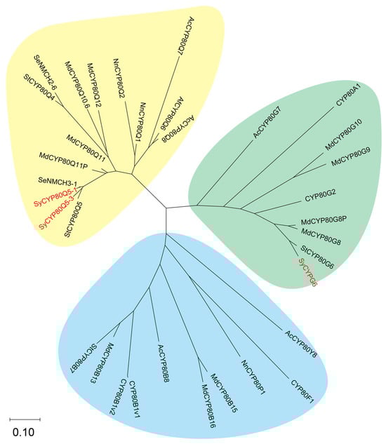 Additionally, we discussed the activity of SyCYP80Q5-1 and SyCYP80G6 on a broader range of BIA substrates and other configurations (Figures S13 and S14). As expected, SyCYP80Q5 and SyCYP80G6 exhibited strict substrate specificity and stereoselectivity, which was consistent with the results of other CYP80s [18]. We performed a phylogenetic analysis of the CYP80 family, and the results showed that the three SyCYP80s clustered within the CYP80 family (Figure 6) were distributed across various clades of the CYP80 family. The functions of these enzymes matched the previously reported enzymes [18], indicating that these three enzymes play similar roles in BIA biosynthesis in S. yunnanensis.