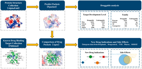 Flow chart of drug analysis and comparison of drug pockets. Protein prediction structures were obtained, and the druggability of the human proteome was analyzed through the prediction of pockets. The predicted pockets were then compared with those of known drug molecules, and the drug was repositioned according to the similarity of the pockets. This resulted in the discovery of new indications and side effects of the drug.